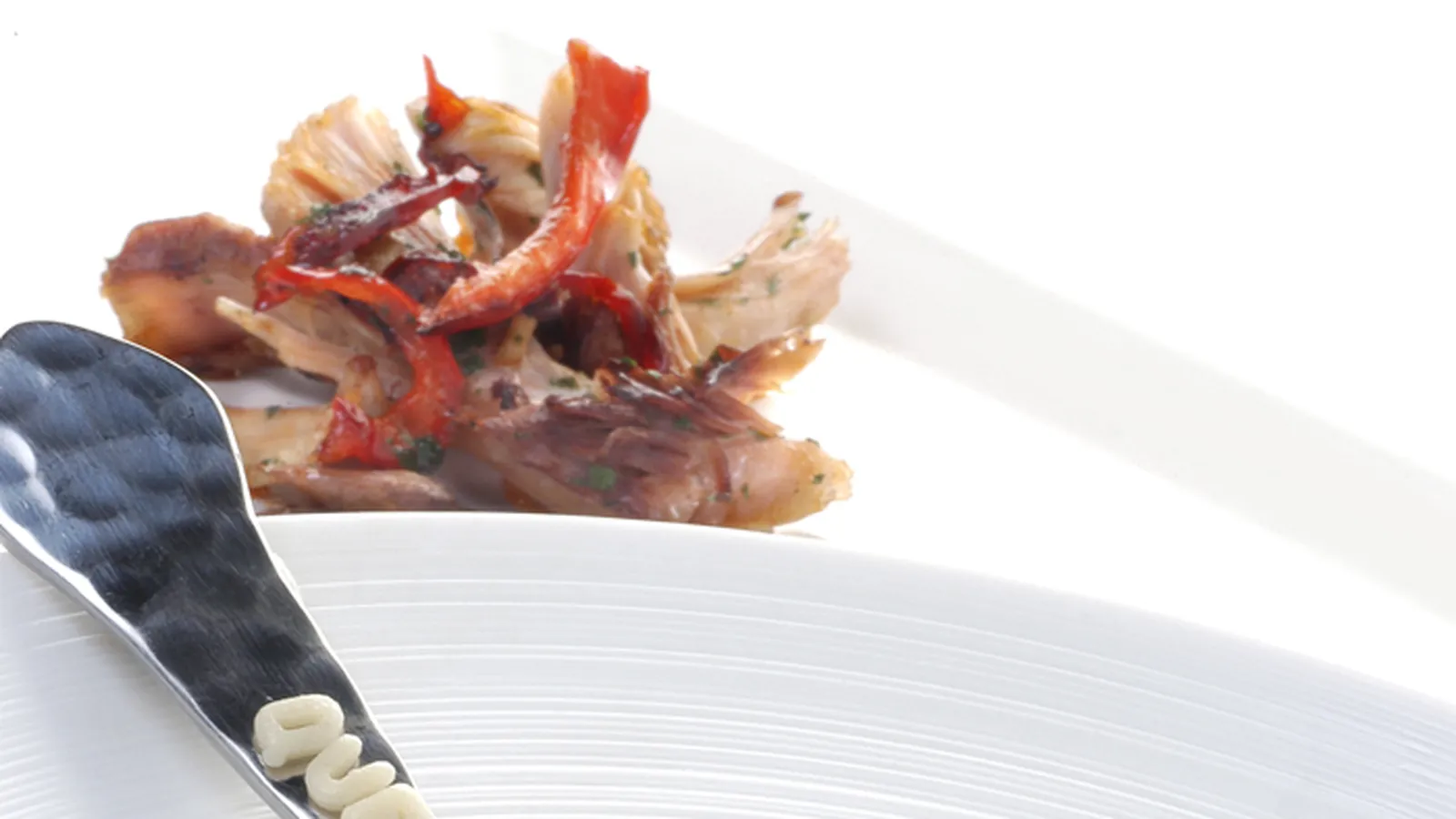 Corta en juliana el pimiento morrón y móchalo en una sartén con un chorrito de aceite y dos dientes de ajo cortados en láminas finas. Agrega el resto de gallina desmigada, sazona y añade perejil picado. Saltea el conjunto. Sirve la sopa y acompaña con la fritada y la verduras cocidas.