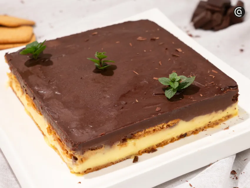 Templa bien la cobertura de chocolate antes de verterla. Si está demasiado caliente puede reblandecer la crema pastelera y mezclar las capas; si está casi fría, se extiende mejor y queda más uniforme.