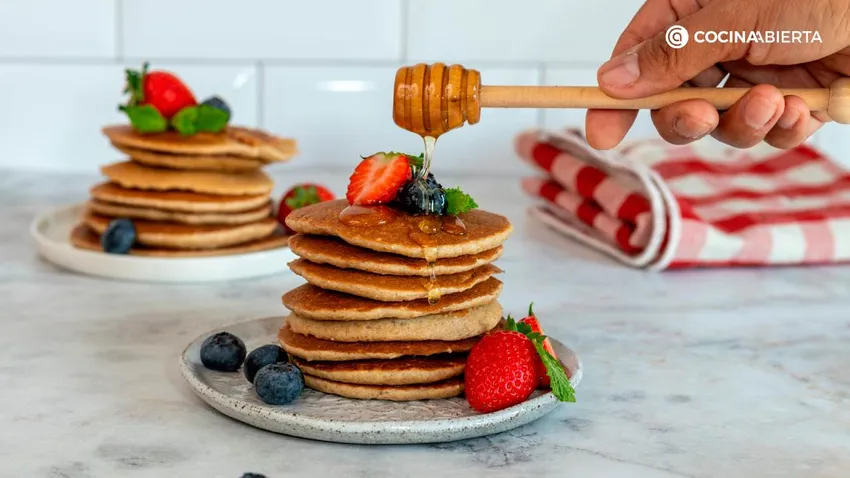 Sirve las tortitas en un plato, añade frutas como arándanos y fresas, y un chorrito de miel.