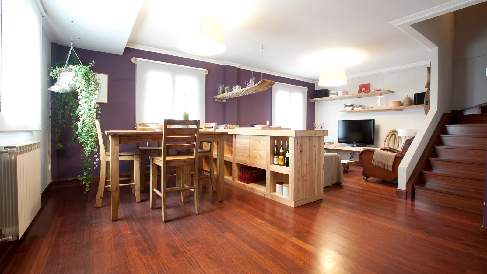Terminamos ubicando una barra de pino, que junto con la balda suspendida, delimitará dos ambientes. En la zona del comedor, colocamos una mesa y unas sillas altas de madera de cedro, y en la de relax, vestimos el sofá con tejidos naturales. Con estos detalles conseguiremos decorar un salón de estilo rústico.