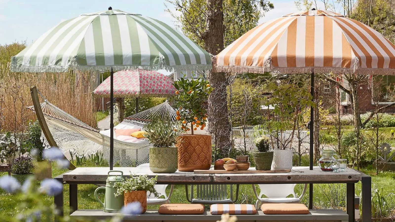 - Apuesta por la simetría en zonas amplias: Si tienes espacio, puedes colocar dos sombrillas semejantes o complementarias en extremos opuestos del jardín, delimitando dos áreas diferenciadas: por ejemplo, una de relax y otra de comedor. Los estampados aportarán cohesión y armonía visual.