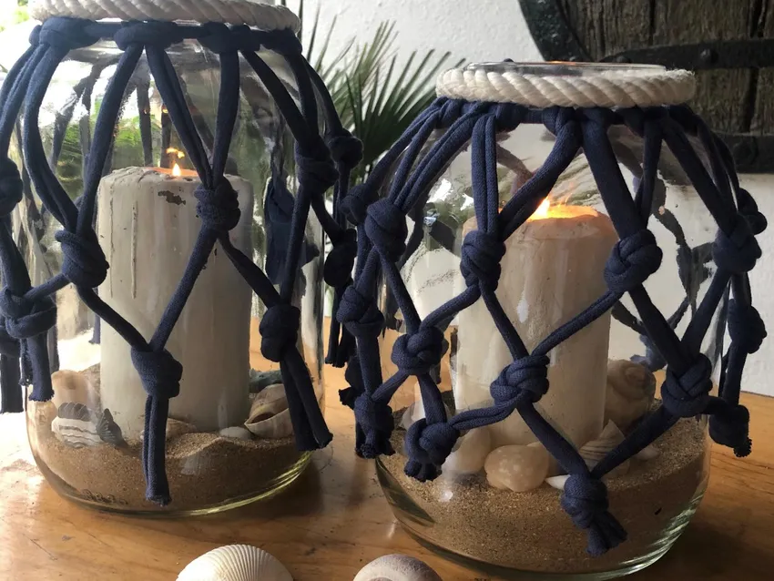 Coloca una vela en el centro, presionando un poco para que se mantenga firme. Para dar un toque final al diseño, puedes rodear la boca del tarro con una cuerda gruesa, como si fuera una trenza marinera. Yo he utilizado una cuerda blanca, pero una cuerda de sisal también quedaría ideal, sobre todo si buscas un aire más rústico.
