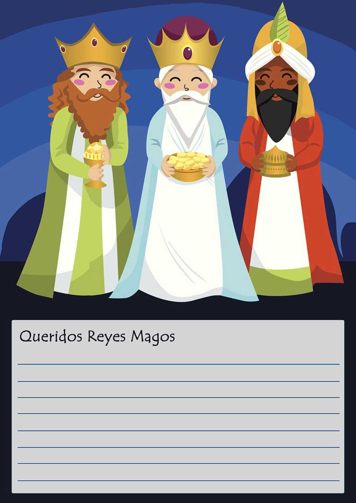 Carta para los Reyes Magos con fondo azul y estrellas y sobre ésta un espacio para escribir y los Reyes Magos en la parte inferior izquierda.
