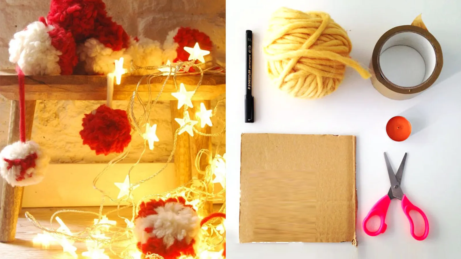 Para hacer pompones de lana necesitas: lana, cartón, tijeras, rotulador, cinta de carrocero y objeto redondo (vela).