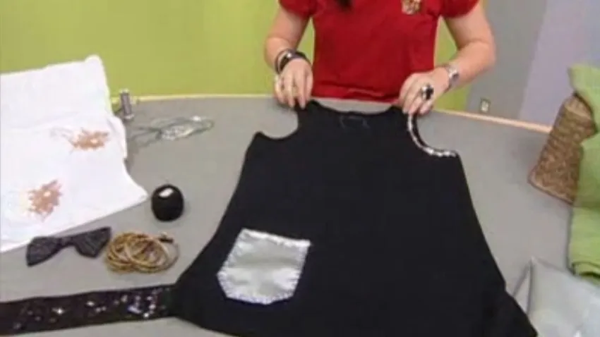 Con un retal de tela de raso plateado vamos a elaborar un pequeño bolsillo. Colocaremos una tira de lentejuelas en la parte superior y utilizaremos un hilo grueso para dejar la puntada vista.