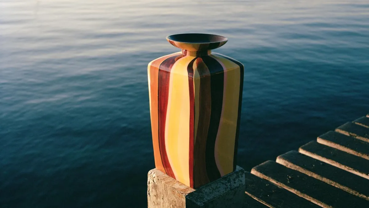 La primera pieza que destaca de la colección es este jarrón con un diseño de rayas irregulares multicolor.