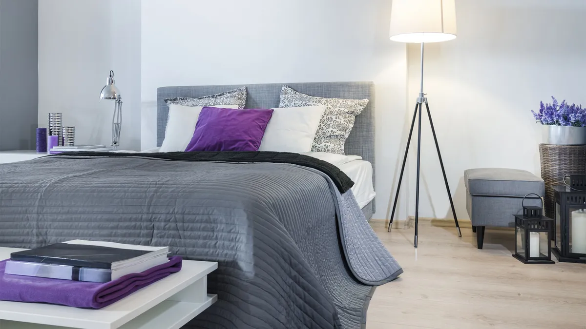 Vamos a ver un ejemplo de cómo decorar un dormitorio en gris y blanco, introduciendo unos toques de color en lila o morado.