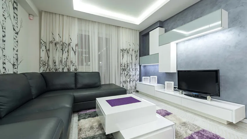 A continuación veremos un ejemplo de decoración de un salón amplio de estilo moderno en color gris, blanco y lila.