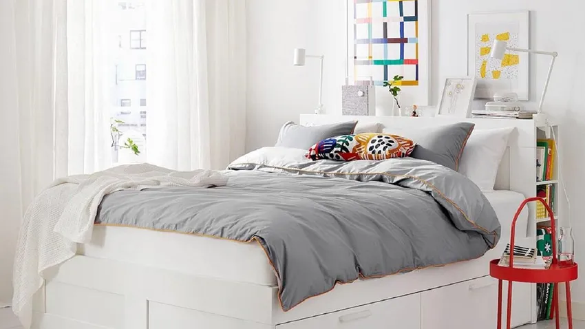 Brimnes es una estructura de cama con diversas zonas de almacenaje. La zona del cabecero cuenta con espacios de almacenaje para guardar libros, móvil, gafas y todo lo que necesites tener a mano. Debajo de la cama cuenta con 4 cajones grandes para para guardar ropa de cama, edredones, almohadas...