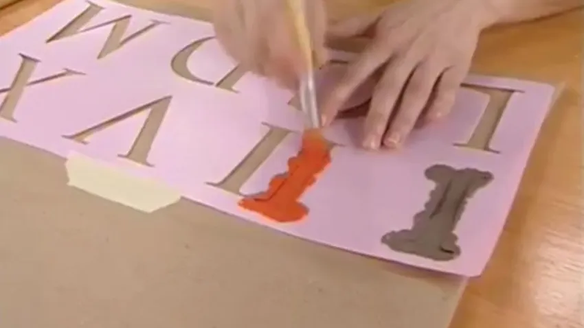Colocamos una cortina de algodón bien estirada sobre la mesa para decorarla como el cojín con la técnica de estarcido. Para trabajar colocamos un cartón bajo la sábana para que la mesa no se manche. Hacemos una cenefa de números romanos en la parte inferior y superior, fijamos la plantilla sobre la cortina con la cinta de carrocero y pintaremos las letras en colores alternos marrón-naranja.