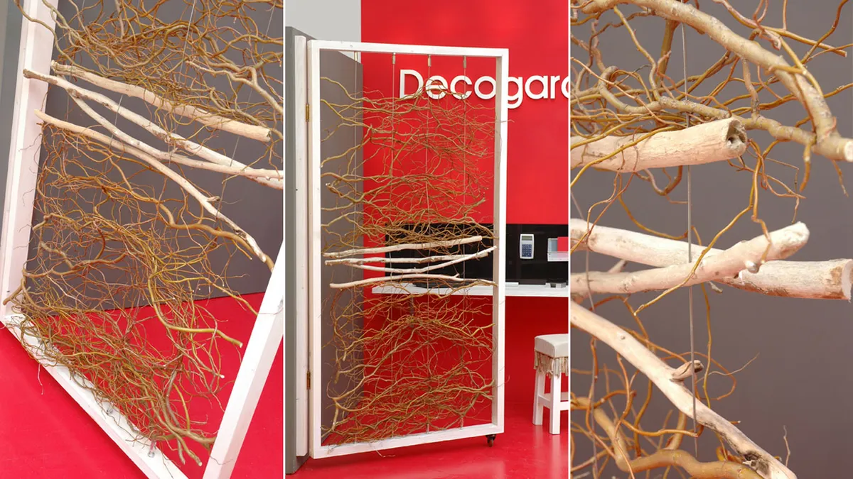 Vamos a realizar un marco de madera para crear el separador y después colocaremos unos tensores de acero que decoramos con ramas tortuosas entrelazadas.