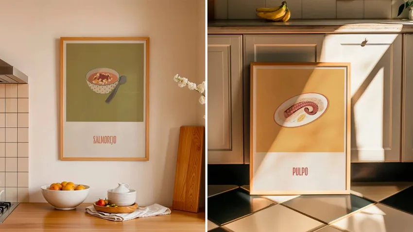 Con unos colores vibrantes y composiciones minimalistas pero castizas al mismo tiempo, estos prints no solo rinden homenaje a algunos de los alimentos más típicos de España, sino que también aportan un aire desenfadado y alegre a cualquier espacio.
