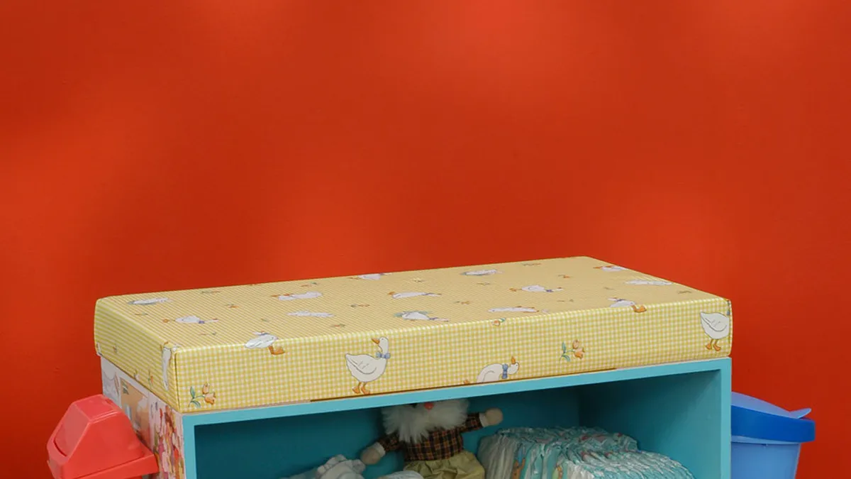 Preparamos una encimera acolchada sobre la que tumbaremos al bebé. Unimos un tablero de DM del tamaño del mueble a una pieza de gomaespuma de la misma medida. Lo tapizamos con más hule, que se limpia fácilmente, tensándolo bien y grapándolo a la madera.