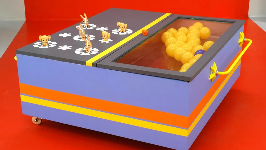 Nuestros muebles además de resultar decorativos pueden ser funcionales: cuantos más usos podamos darles, mejor. Un ejemplo claro es la mesa de centro que conseguiremos con un armario de cocina. Además de cumplir las función habitual de cualquier mesita de centro, se convertirá en un tablero para jugar al 3 en raya. Completaremos nuestra mesa de juegos con un divertido expositor lleno de bolas de diferentes colores.