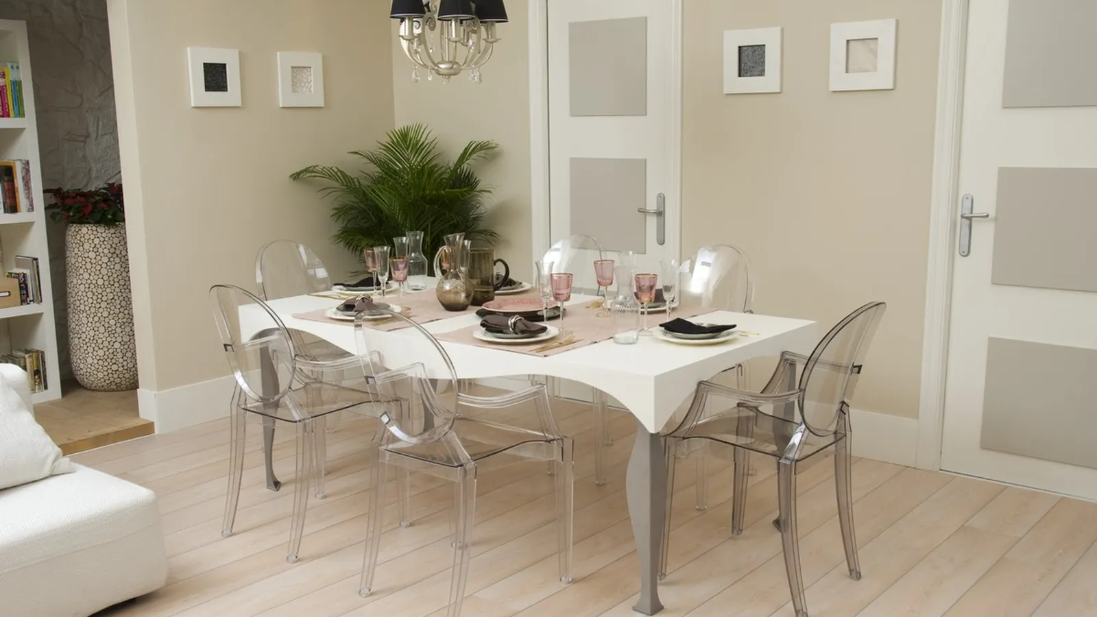 Las sillas que hemos utilizado para vestir esta mesa, son transparentes y muy ligeras visualmente, además de encajar perfectamente con el estilo de la mesa.