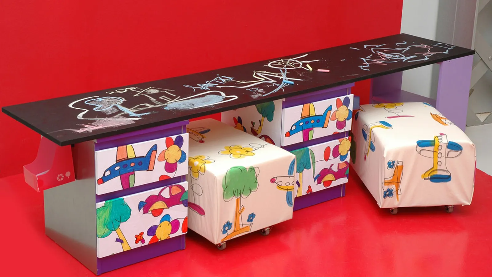 El frontal de los cajones lo decoramos con dibujos coloreados por nuestros propios hijos. Los pegamos utilizando cola blanca. Una vez que la cola haya secado cortamos con una cuchilla el sobrante por todo el perímetro.