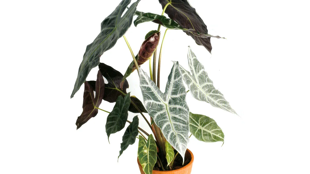La alocasia amazónica es una planta de interior con hojas de gran tamaño, con matices blanquecinos que dibujan la nervadura de la hoja en su parte superior.
