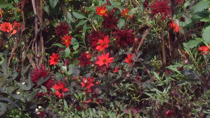Y es que, en este parterre, se puede encontrar una gran variedad de dalias con distintos tipos de flores así como distintas tonalidades: rojas, granates... Todas ellas perfectamente bien combinadas con un ricino de hoja granate casi negra y amarantos que emergen entre las dalias y algunos sedum.