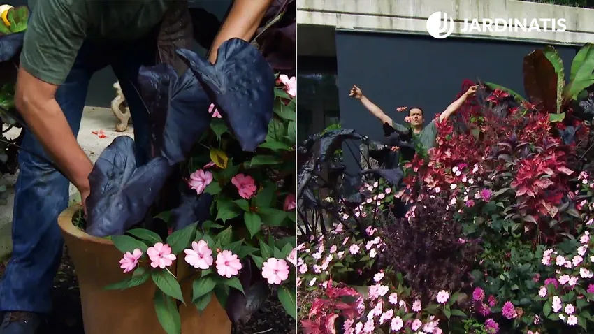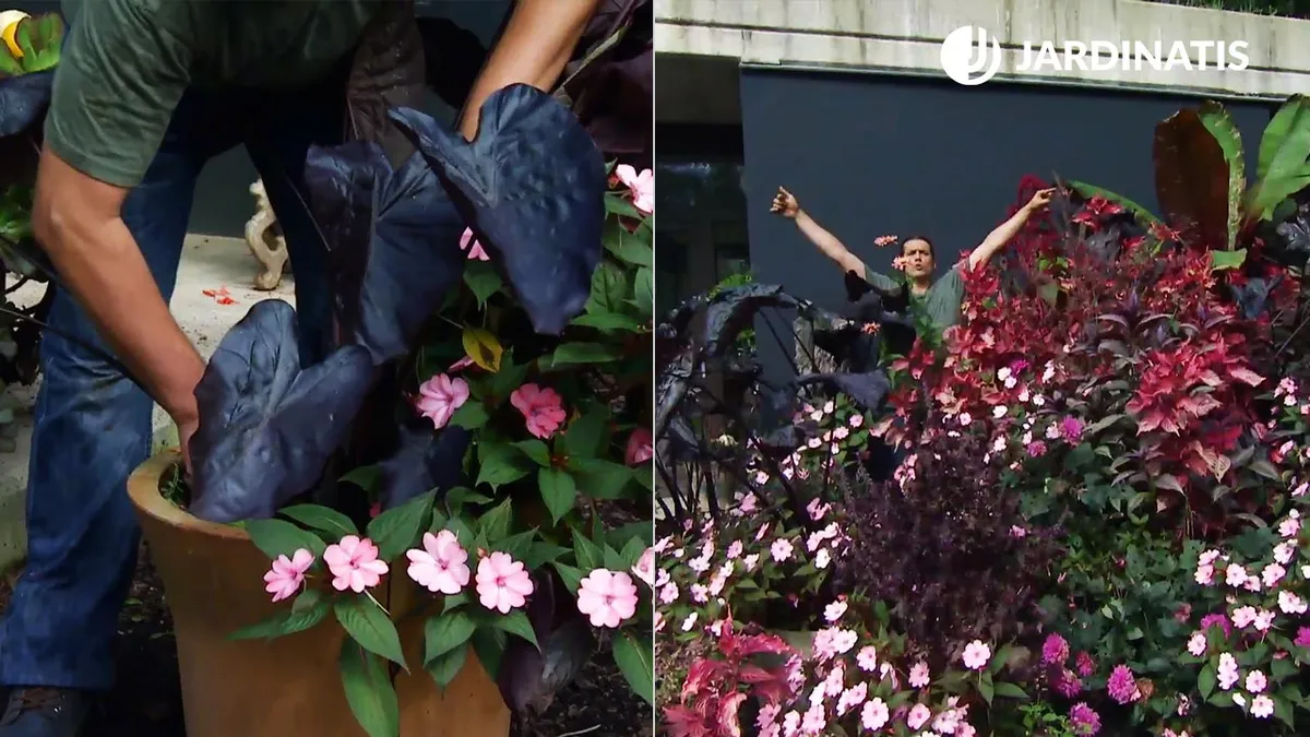 Parterre floral en tonos rosas y negros con alegrías guineanas y orejas de elefante