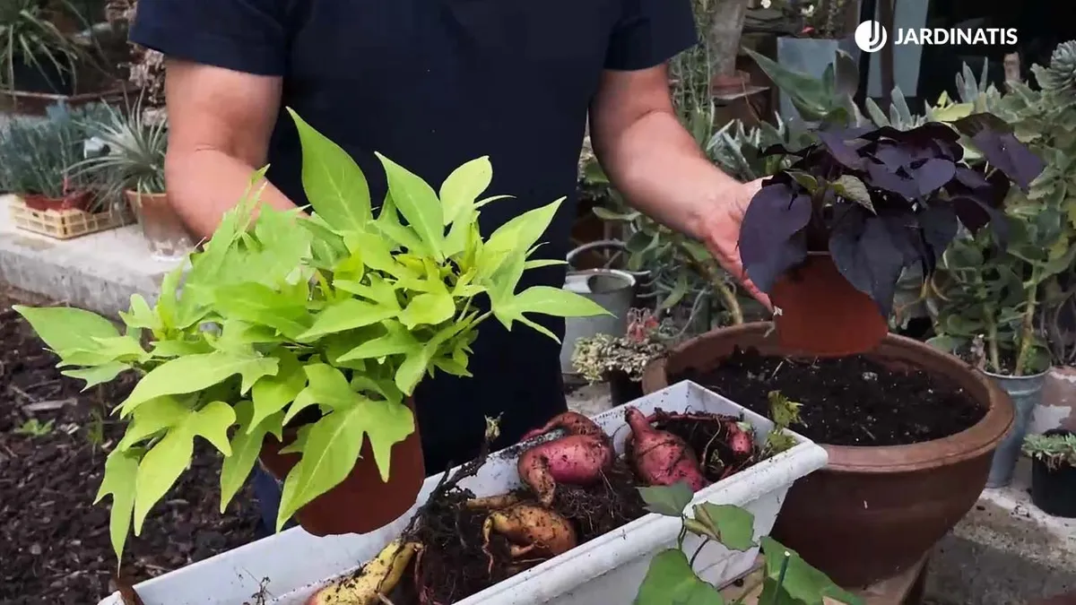 Boniatos comestibles plantados en contenedor
