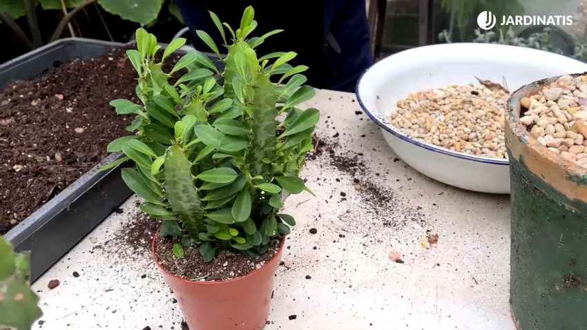 Plantación de la Euphorbia trigona en un nuevo contenedor