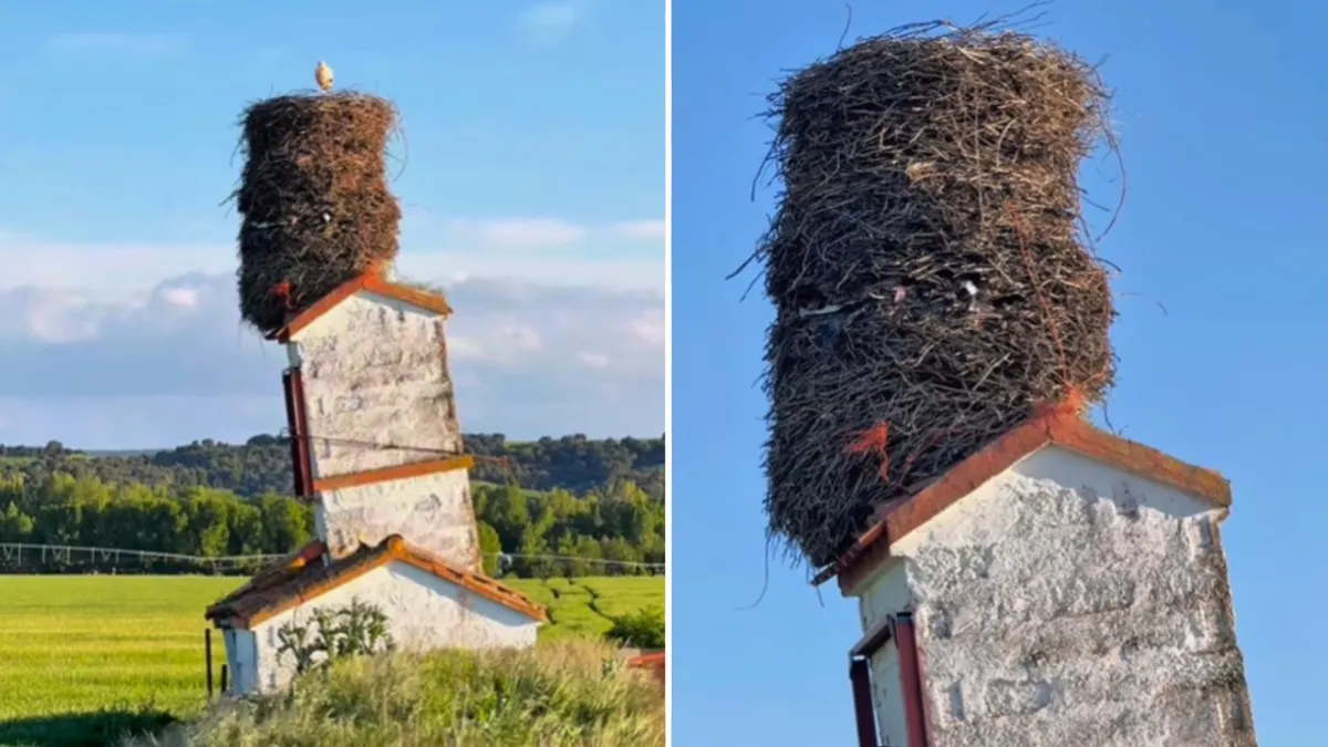 El gigantesco nido de cigüeña que se equilibra sobre una torre inclinada y sorprende a todos