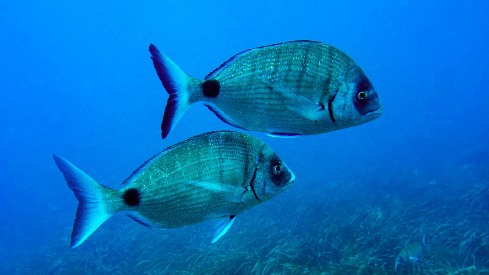 Podríamos llamar a los sargos (Diplodus sargus) los plateados curiosos. ¿El motivo? Son de los primeros en aparecer cuando te metes en el agua. Tienen un cuerpo ovalado y de color plateado, muy sencillos de reconocer gracias a la franja negra que tienen junto a la cola. Nadan tranquilos entre rocas y praderas de posidonia, normalmente en pequeños grupos. Son omnívoros y, a veces, se les ha visto mordisqueando incluso erizos de mar. Tienen una dentadura sorprendente, ¡parece casi humana! Por lo que a veces se popularizan videos en las redes sociales. Aun así, no te preocupes, ¡existen los peces con dientes!
